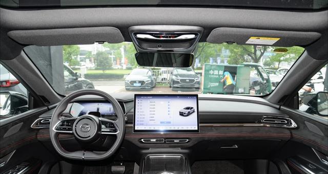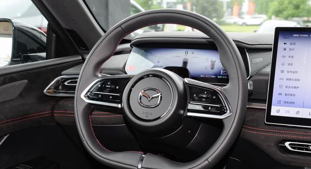 来到前排,马自达EZ-6运动版的座舱设计也比较的简单大气,传统T型对称式的布局加上悬浮式多媒体屏幕、平底式双幅方向盘,在纯黑色主色调的烘托下显得很耐看,而大面积真皮包裹、红色线缝条和麂皮包裹相呼应,档次感不错。